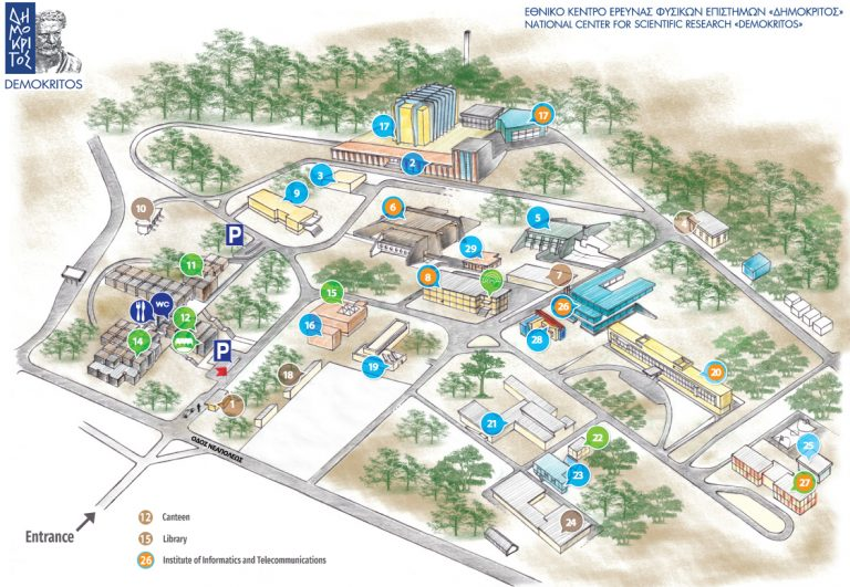 By Metro and Bus: Take line 3 of the metro (blue line) to "Agia Marina" direction and get off at "Nomismatokopio" stop. Follow the "Kondylaki" exit where you can reach the bus station. Take the B5 bus or the 407 and 406 buses towards the direction of Aghia Paraskevi, and get off at the "4th stop of Ag. Paraskevi / Demokritos". The bus stop is next to the main entrance of NCSR Demokritos. Depending on the traffic, this journey from the airport of Athens may take approximately 35 minutes.